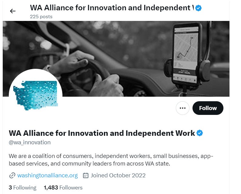 Their PR push is showing up everywhere. One of the most ridiculous is a twitter bot (or poorly staffed twitter account, it’s hard to tell) representing the “WA Alliance for Innovation and Independent Work.”
